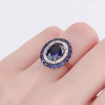 Кольцо с 30 бриллиантами природными, 0.1 карат, огранка круг 17 граней, цвет 2, чистота 2, тип огранки А; 1 сапфиром синтетическим, 3.14 карат; 20 сапфирами синтетическими, 0.86 карат; Розовое золото 585 пробы.
