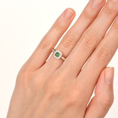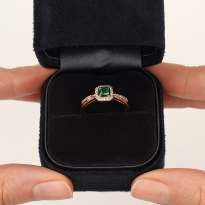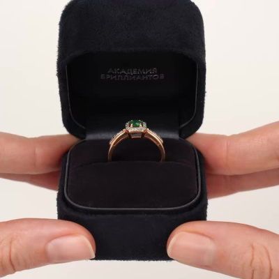 Кольцо с 26 бриллиантами природными, 0.1 карат, огранка круг 17 граней, цвет 2, чистота 2, тип огранки А; 1 изумрудом природным, 0.22 карат, цвет 3, чистота 3, тип огранки В; Розовое золото 585 пробы.