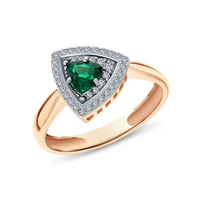 Кольцо с 3 бриллиантами природными, 0.02 карат, огранка круг 17 граней, цвет 2, чистота 2, тип огранки А; 33 бриллиантами природными, 0.13 карат, огранка круг 17 граней, цвет 2, чистота 2, тип огранки А; 1 гидротермальным изумрудом, 0.41 карат; Розовое золото 585 пробы.
