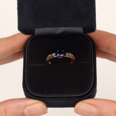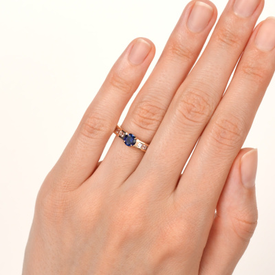 Кольцо с 1 сапфиром синтетическим, 0.63 карат; 10 топазами бесцветными природными, 0.52 карат; Розовое золото 585 пробы.