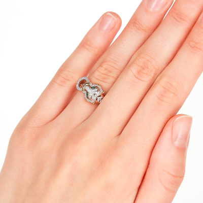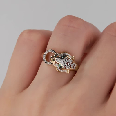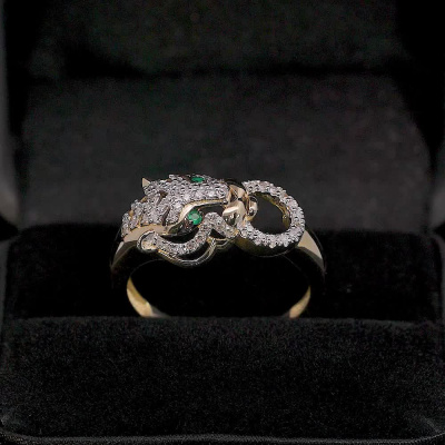 Кольцо с 12 бриллиантами природными, 0.04 карат, огранка круг 17 граней, цвет 2, чистота 2, тип огранки А; 47 бриллиантами природными, 0.12 карат, огранка круг 17 граней, цвет 2, чистота 2, тип огранки А; 2 изумрудами природными, 0.01 карат, цвет 3, чистота 3, тип огранки В; Желтое золото 585 пробы.