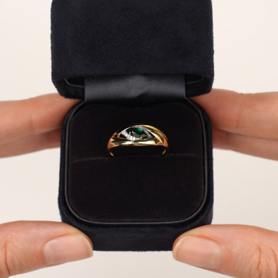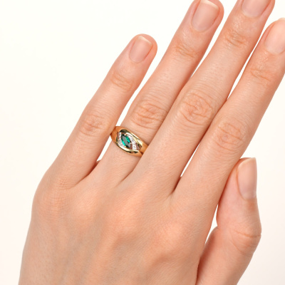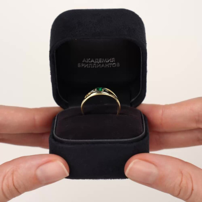 Кольцо с 6 бриллиантами природными, 0.02 карат, огранка круг 17 граней, цвет 2, чистота 2, тип огранки Б; 6 бриллиантами природными, 0.01 карат, огранка круг 17 граней, цвет 2, чистота 2, тип огранки Б; 1 гидротермальным изумрудом, 0.22 карат; Желтое золото 585 пробы.