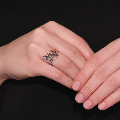 Кольцо с 1 бриллиантом природным, 0.005 карат, огранка круг 17 граней, цвет 2, чистота 2, тип огранки А; 15 бриллиантами природными, 0.04 карат, огранка круг 17 граней, цвет 2, чистота 2, тип огранки А; 10 изумрудами природными, 0.06 карат, цвет 3, чистота 3, тип огранки В; 2 бриллиантами черными природными облагороженными, 0.01 карат, огранка круг 57 граней, цвет 7, чистота 6, тип огранки А; Розовое золото 585 пробы.