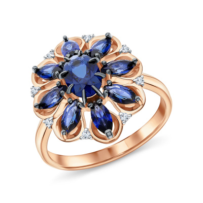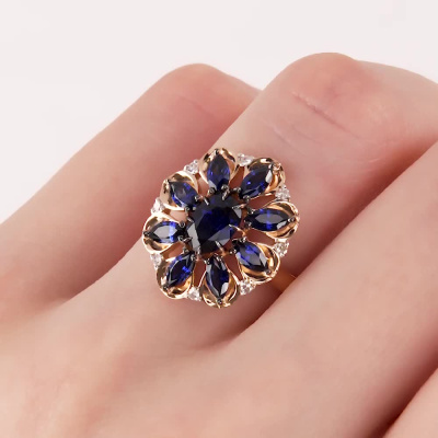 Кольцо с 8 бриллиантами природными, 0.06 карат, огранка круг 17 граней, цвет 2, чистота 2, тип огранки А; 1 сапфиром синтетическим, 0.92 карат; 8 сапфирами синтетическими, 1.26 карат; Розовое золото 585 пробы.