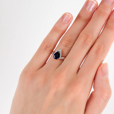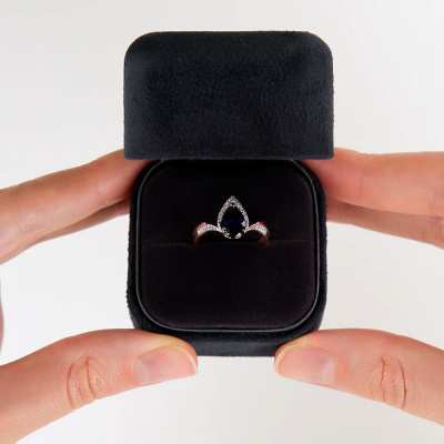 Кольцо с 9 бриллиантами природными, 0.07 карат, огранка круг 17 граней, цвет 2, чистота 2, тип огранки А; 10 бриллиантами природными, 0.04 карат, огранка круг 17 граней, цвет 2, чистота 2, тип огранки А; 1 сапфиром синтетическим, 1.32 карат, тип огранки Б; Розовое золото 585 пробы.