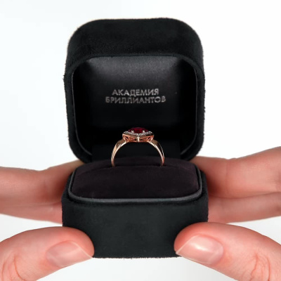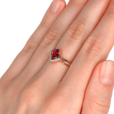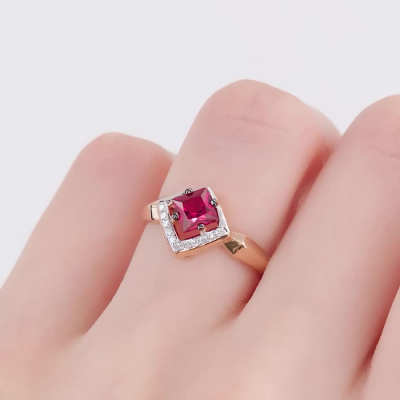 Кольцо с 11 бриллиантами природными, 0.04 карат, огранка круг 17 граней, цвет 2, чистота 2, тип огранки А; 1 рубином синтетическим, 0.75 карат; Розовое золото 585 пробы.