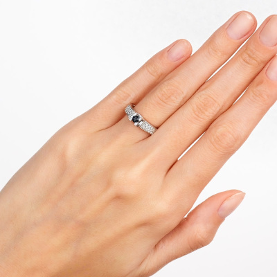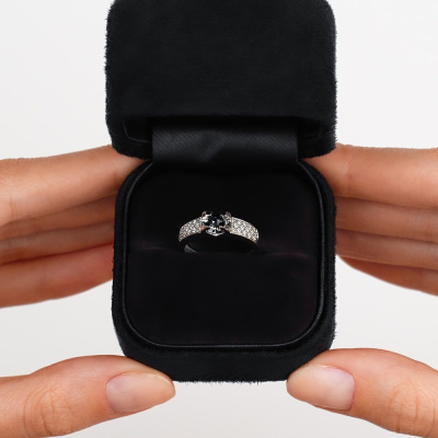 Кольцо «Бриллианты Якутии» с 1 сапфиром, 0.223 карат, цвет 2, чистота 2, тип огранки В; 26 бриллиантами, 0.134 карат, огранка круг 57 граней, цвет 4, чистота 6, тип огранки А; Белое золото 585 пробы.
