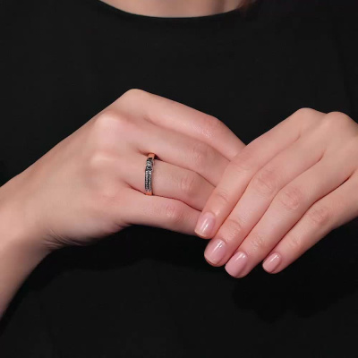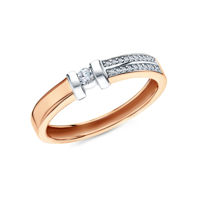 Кольцо с 1 бриллиантом природным, 0.07 карат, огранка круг 57 граней, цвет 3, чистота 5, тип огранки А; 20 бриллиантами природными, 0.07 карат, огранка круг 17 граней, цвет 2, чистота 3, тип огранки Б; Розовое и белое золото 585 пробы.