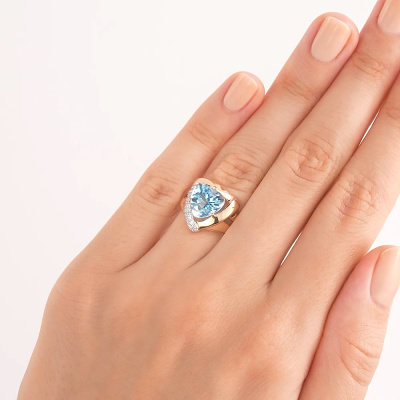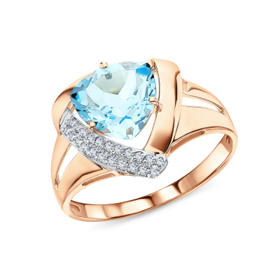 Кольцо с 22 бриллиантами природными, 0.08 карат, огранка круг 17 граней, цвет 2, чистота 2; 1 топазом скай природным, 2.85 карат; Розовое золото 585 пробы.