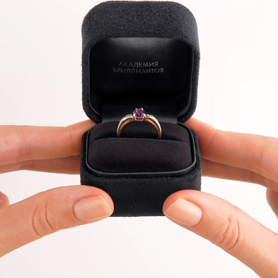 Кольцо с 8 бриллиантами природными, 0.03 карат, огранка круг 17 граней, цвет 2, чистота 2, тип огранки А; 14 бриллиантами природными, 0.03 карат, огранка круг 17 граней, цвет 2, чистота 2, тип огранки А; 1 аметистом природным, 0.61 карат; Розовое золото 585 пробы.