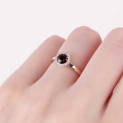 Кольцо с 17 бриллиантами природными, 0.06 карат, огранка круг 17 граней, цвет 2, чистота 2, тип огранки А; 1 гранатом природным, 0.58 карат; Розовое золото 585 пробы.