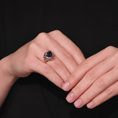 Кольцо с 30 бриллиантами природными, 0.08 карат, огранка круг 17 граней, цвет 2, чистота 2, тип огранки Б; 1 александритом синтетическим, 3.55 карат; Розовое золото 585 пробы.