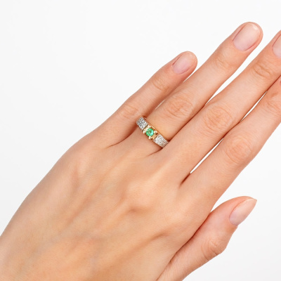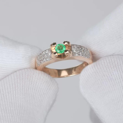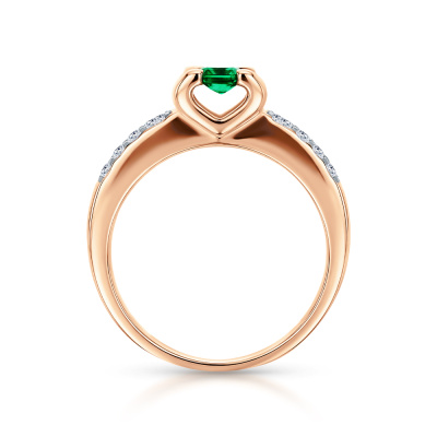 Кольцо с 1 изумрудом, 0.161 карат, цвет 3, чистота 3, тип огранки В; 26 бриллиантами, 0.134 карат, огранка круг 57 граней, цвет 4, чистота 6, тип огранки А; Розовое золото 585 пробы.