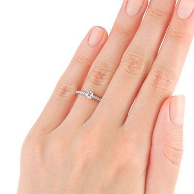 Кольцо с 1 бриллиантом природным, 0.23 карат, огранка круг 57 граней, цвет 3, чистота 6, тип огранки А; 20 бриллиантами природными, 0.12 карат, огранка круг 57 граней, цвет 3, чистота 6, тип огранки А; Платина 950 пробы.