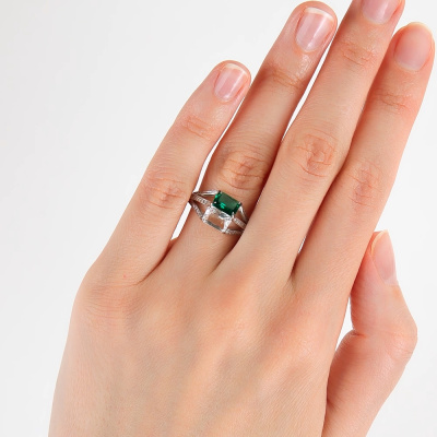 Кольцо с 54 бриллиантами природными, 0.11 карат, огранка круг 17 граней, цвет 2, чистота 2, тип огранки А; 1 топазом бесцветным природным, 1.11 карат; 1 гидротермальным изумрудом, 0.74 карат; Белое золото 585 пробы.