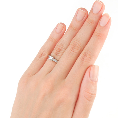 Кольцо с 1 бриллиантом природным, 0.19 карат, огранка круг 57 граней, цвет 3, чистота 6, тип огранки А; 10 бриллиантами природными, 0.03 карат, огранка круг 57 граней, цвет 3, чистота 6, тип огранки А; Платина 950 пробы.