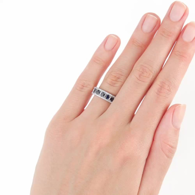 Кольцо с 42 бриллиантами природными, 0.09 карат, огранка круг 17 граней, цвет 2, чистота 2, тип огранки А; 5 сапфирами природными, 0.58 карат, цвет 2, чистота 2, тип огранки Б; Белое золото 585 пробы.
