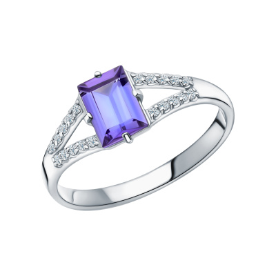Кольцо «Бриллианты Якутии» с 1 танзанитом, 0.964 карат, тип огранки Б; 20 бриллиантами, 0.087 карат, огранка круг 57 граней, цвет 3, чистота 6, тип огранки А; Белое золото 585 пробы.