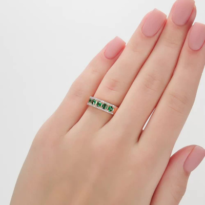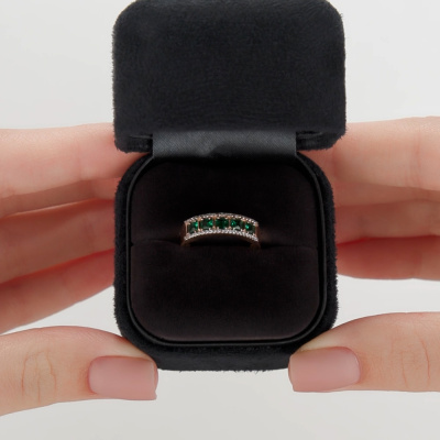 Кольцо с 42 бриллиантами природными, 0.089 карат, огранка круг 17 граней, цвет 2, чистота 2, тип огранки А; 5 гидротермальными изумрудами, 0.379 карат; Розовое золото 585 пробы.
