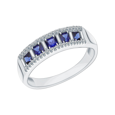 Кольцо с 5 сапфирами синтетическими, 0.53 карат, тип огранки Б; 42 бриллиантами, 0.1 карат, огранка круг 17 граней, цвет 2, чистота 2, тип огранки Б; Белое золото 585 пробы.