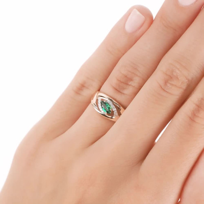 Кольцо с 6 бриллиантами природными, 0.02 карат, огранка круг 17 граней, цвет 2, чистота 2, тип огранки Б; 6 бриллиантами природными, 0.01 карат, огранка круг 17 граней, цвет 2, чистота 2, тип огранки Б; 1 гидротермальным изумрудом, 0.22 карат; Розовое золото 585 пробы.