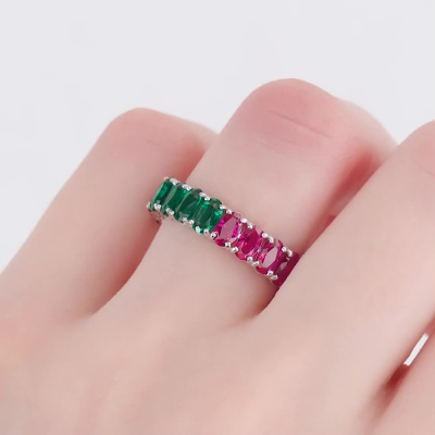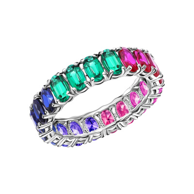 Кольцо с 4 сапфирами розовыми природными, 5.61 карат; 3 сапфирами синтетическими, 0.78 карат; 3 рубинами синтетическими, 0.71 карат; 4 танзанитами природными, 0.89 карат; 3 гидротермальными изумрудами, 0.55 карат; Белое золото 585 пробы.