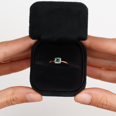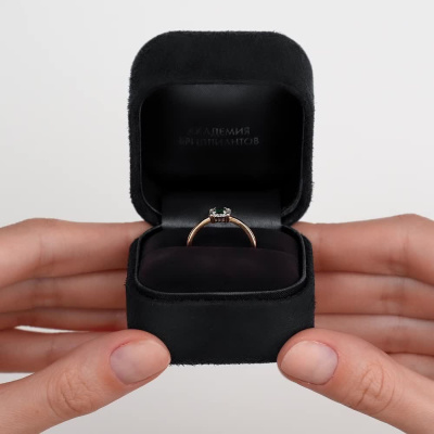 Кольцо «Бриллианты Якутии» с 1 гидротермальным изумрудом , 0.129 карат, тип огранки Б; 12 бриллиантами, 0.042 карат, огранка круг 17 граней, цвет 2, чистота 2, тип огранки Б; Розовое золото 585 пробы.