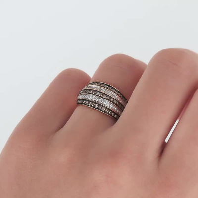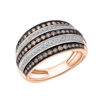 Кольцо с 42 бриллиантами природными, 0.17 карат, огранка круг 57 граней, цвет 4, чистота 6, тип огранки А; 23 бриллиантами коньячными природными, 0.22 карат, огранка круг 57 граней, цвет 7, чистота 7, тип огранки А; 30 бриллиантами коньячными природными, 0.17 карат, огранка круг 57 граней, цвет 7, чистота 7, тип огранки А; Розовое золото 585 пробы.