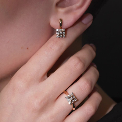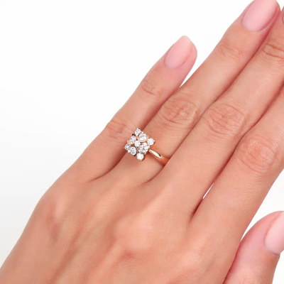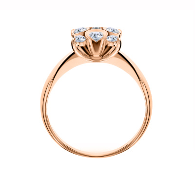 Кольцо с 4 бриллиантами природными, 0.31 карат, огранка круг 57 граней, цвет 3, чистота 6, тип огранки А; 4 бриллиантами природными, 0.19 карат, огранка круг 57 граней, цвет 3, чистота 6, тип огранки А; 1 бриллиантом природным, 0.04 карат, огранка круг 57 граней, цвет 3, чистота 6, тип огранки А; Розовое золото 585 пробы.