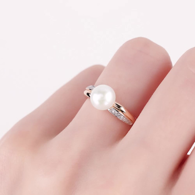 Кольцо с 14 бриллиантами природными, 0.03 карат, огранка круг 17 граней, цвет 2, чистота 2, тип огранки А; 1 жемчугом пресноводным культивированным белым, тип огранки В; Розовое золото 585 пробы.