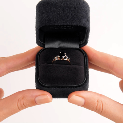 Кольцо с 6 бриллиантами природными, 0.01 карат, огранка круг 17 граней, цвет 2, чистота 2, тип огранки Б; 1 шпинелью черной природной, 1.32 карат; 2 шпинелями черными природными, 0.08 карат; Розовое золото 585 пробы.