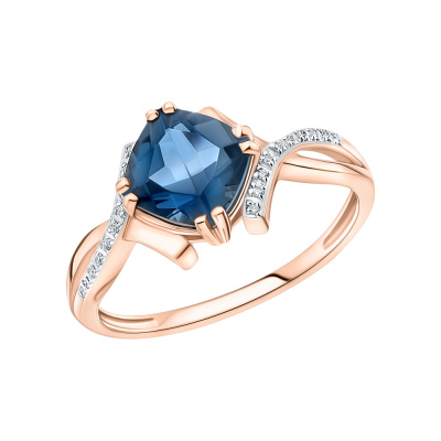Кольцо с 20 бриллиантами природными, 0.04 карат, огранка круг 17 граней, цвет 2, чистота 2, тип огранки А; 1 топазом лондон природным, 1.6 карат; Розовое золото 585 пробы.