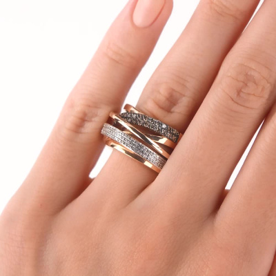 Кольцо с 119 бриллиантами природными, 0.21 карат, огранка круг 17 граней, цвет 2, чистота 2, тип огранки А; 32 бриллиантами коньячными природными, 0.4 карат, огранка круг 57 граней, цвет 7, чистота 5, тип огранки А; Розовое золото 585 пробы.