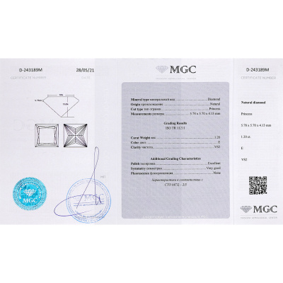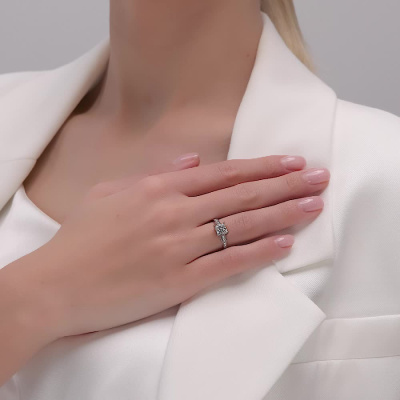 Кольцо с 1 бриллиантом природным, 1 карат, огранка принцесса 65 граней, цвет 3, чистота 7, тип огранки А; 16 бриллиантами природными, 0.2 карат, огранка круг 57 граней, цвет 3, чистота 6, тип огранки А; Белое золото 585 пробы.