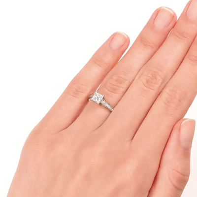 Кольцо с 1 бриллиантом природным, 0.7 карат, огранка принцесса 65 граней, цвет 4, чистота 6, тип огранки А; 18 бриллиантами природными, 0.14 карат, огранка круг 57 граней, цвет 4, чистота 6, тип огранки А; Белое золото 585 пробы.