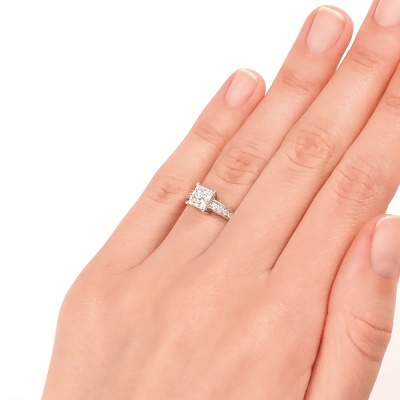 Кольцо с 1 бриллиантом природным, 1.01 карат, огранка принцесса 65 граней, цвет 4, чистота 6, тип огранки А; 16 бриллиантами природными, 0.19 карат, огранка круг 57 граней, цвет 3, чистота 6, тип огранки А; Белое золото 585 пробы.
