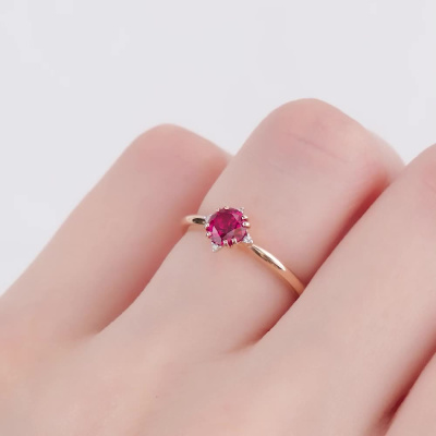 Кольцо с 1 рубином синтетическим, 0.55 карат, тип огранки В; 4 бриллиантами, 0.01 карат, огранка круг 17 граней, цвет 2, чистота 2, тип огранки А; Розовое золото 585 пробы.