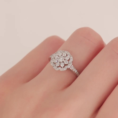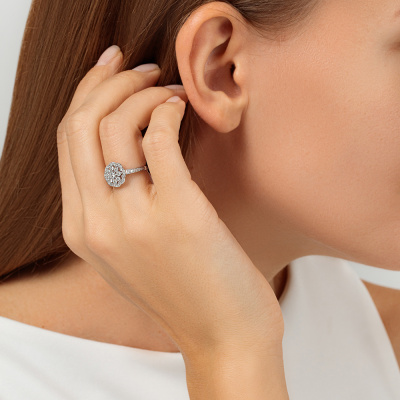 Кольцо с 1 бриллиантом природным, 0.1 карат, огранка круг 57 граней, цвет 3, чистота 6, тип огранки А; 8 бриллиантами природными, 0.23 карат, огранка круг 57 граней, цвет 3, чистота 6, тип огранки А; 34 бриллиантами природными, 0.25 карат, огранка круг 57 граней, цвет 3, чистота 6, тип огранки А; 4 бриллиантами природными, 0.01 карат, огранка круг 17 граней, цвет 2, чистота 2, тип огранки А; Белое золото 585 пробы.