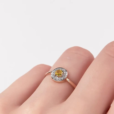 Кольцо с 15 бриллиантами природными, 0.04 карат, огранка круг 17 граней, цвет 2, чистота 2, тип огранки Б; 1 сапфиром желтым природным, 0.21 карат; Розовое золото 585 пробы.