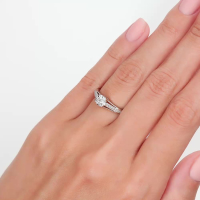 Кольцо с 1 бриллиантом природным, 0.05 карат, огранка круг 57 граней, цвет 3, чистота 6, тип огранки А; 6 бриллиантами природными, 0.11 карат, огранка круг 57 граней, цвет 3, чистота 6, тип огранки А; 16 бриллиантами природными, 0.04 карат, огранка круг 17 граней, цвет 2, чистота 2, тип огранки А; Белое золото 585 пробы.