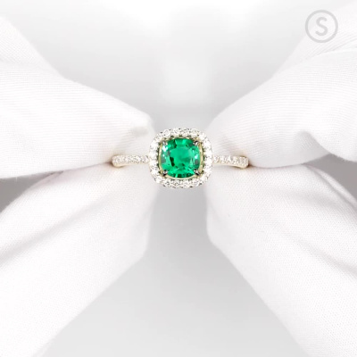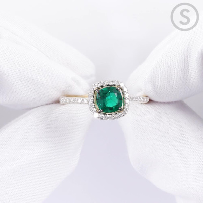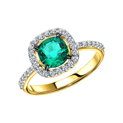 Кольцо «Бриллианты Якутии» с 1 гидротермальным изумрудом, 0.877 карат, тип огранки Б; 34 бриллиантами, 0.27 карат, огранка круг 17 граней, цвет 2, чистота 2, тип огранки Б; Желтое золото 585 пробы.