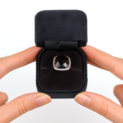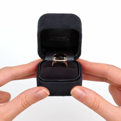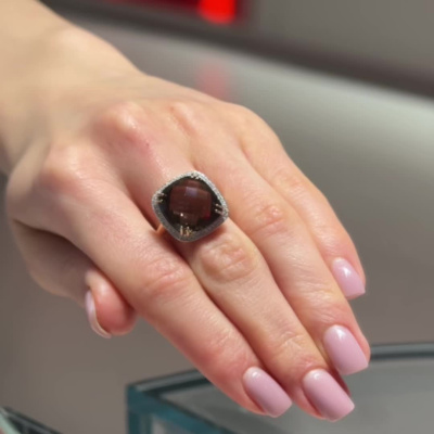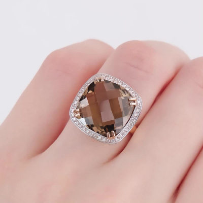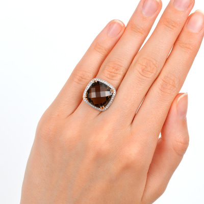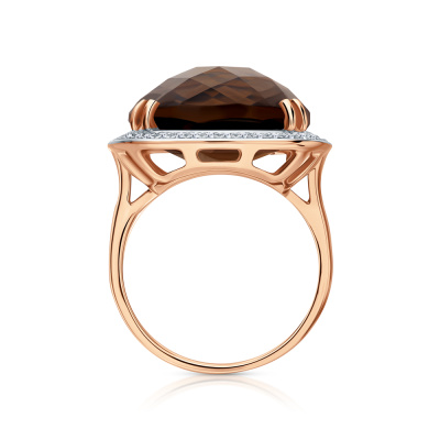 Кольцо с 44 бриллиантами природными, 0.19 карат, огранка круг 17 граней, цвет 2, чистота 2, тип огранки Б; 1 кварцем дымчатым природным, 9.86 карат; Розовое золото 585 пробы.