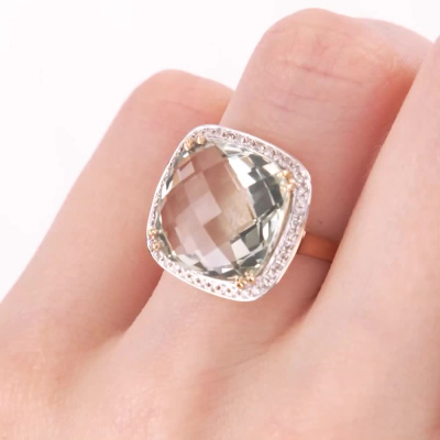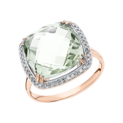 Кольцо с 44 бриллиантами природными, 0.16 карат, огранка круг 17 граней, цвет 2, чистота 2, тип огранки Б; 1 празиолитом природным, 9.54 карат; Розовое золото 585 пробы.