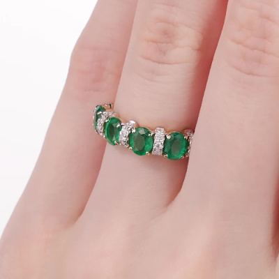 Кольцо с 30 бриллиантами природными, 0.25 карат, огранка круг 57 граней, цвет 3, чистота 6, тип огранки А; 5 изумрудами природными, 1.45 карат, цвет 3, чистота 3, тип огранки Б; Желтое золото 585 пробы.