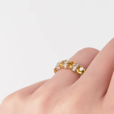 Кольцо с 30 бриллиантами природными, 0.28 карат, огранка круг 57 граней, цвет 3, чистота 6, тип огранки А; 5 сапфирами желтыми природными, 2.21 карат, тип огранки Б; Желтое золото 585 пробы.