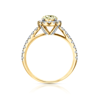 Кольцо с 28 бриллиантами природными, 0.22 карат, огранка круг 57 граней, цвет 3, чистота 6, тип огранки А; 12 бриллиантами природными, 0.02 карат, огранка круг 17 граней, цвет 2, чистота 2, тип огранки А; 1 бриллиантом желтым природным, 0.07 карат, огранка круг 57 граней, цвет 8-5, чистота 8, тип огранки А; Желтое золото 585 пробы.