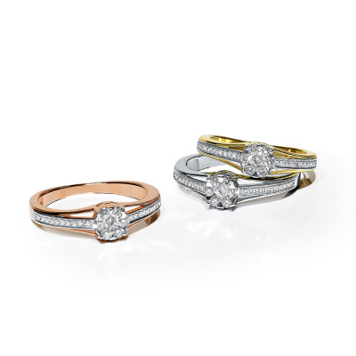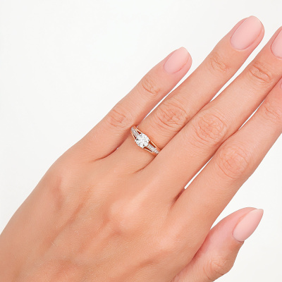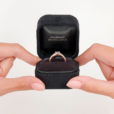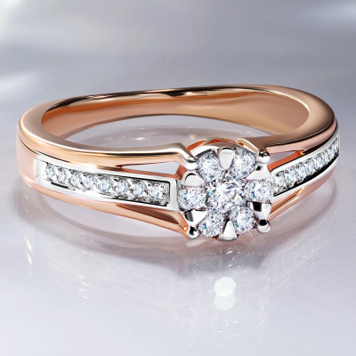 Кольцо с 1 бриллиантом, 0.058 карат, огранка круг 57 граней, цвет 3, чистота 6, тип огранки А; 6 бриллиантами, 0.12 карат, огранка круг 57 граней, цвет 3, чистота 6, тип огранки А; 16 бриллиантами, 0.052 карат, огранка круг 17 граней, цвет 2, чистота 2, тип огранки Б; Розовое золото 585 пробы.