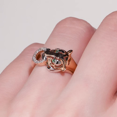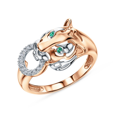 Кольцо с 12 бриллиантами природными, 0.04 карат, огранка круг 17 граней, цвет 2, чистота 2, тип огранки Б; 2 изумрудами природными, 0.009 карат, цвет 3, чистота 3, тип огранки В; Розовое золото 585 пробы.
