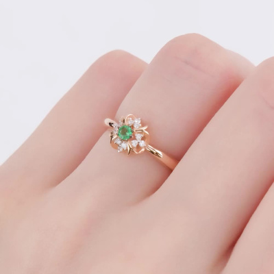 Кольцо с 12 бриллиантами природными, 0.08 карат, огранка круг 57 граней, цвет 3, чистота 6, тип огранки А; 1 изумрудом природным, 0.07 карат, цвет 3, чистота 3, тип огранки В; Розовое золото 585 пробы.