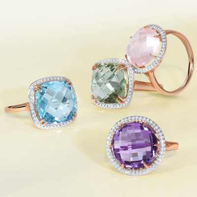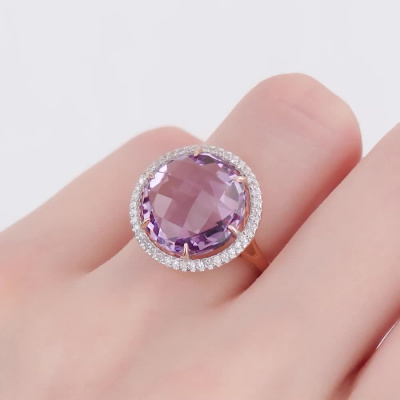 Кольцо с 1 аметистом, 9.7 карат, тип огранки Б; 46 бриллиантами, 0.17 карат, огранка круг 17 граней, цвет 2, чистота 2, тип огранки Б; Розовое золото 585 пробы.